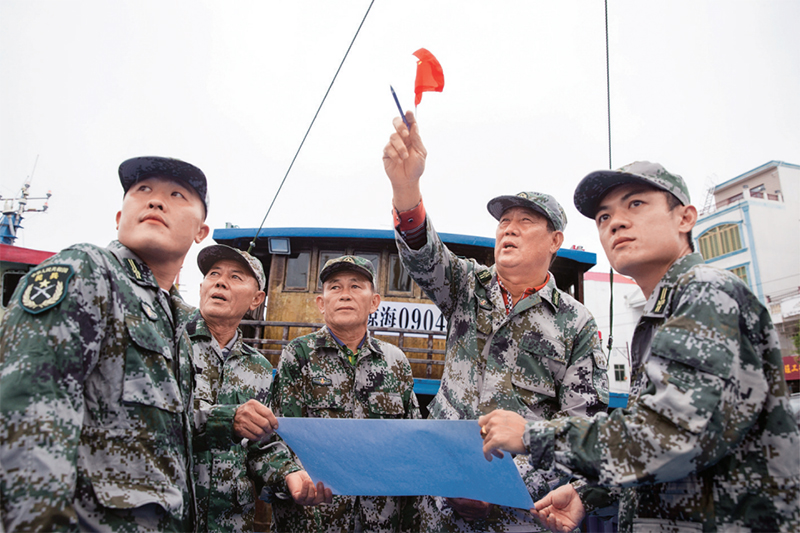 圖為2018年12月10日,王書茂(右二)在海南省瓊海市潭門鎮(zhèn)組織民兵開展訓(xùn)練。 新華社發(fā) 宋國(guó)強(qiáng)/攝