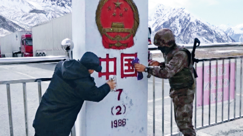 10多年來,拉齊尼·巴依卡守衛(wèi)神圣國土、捍衛(wèi)祖國尊嚴(yán),多次冒著生命危險救助巡邏戰(zhàn)士,足跡踏遍帕米爾高原邊防一線。圖為2016年拉齊尼(左)在紅其拉甫國門與某邊防部隊?wèi)?zhàn)士一起擦界碑。 新疆維吾爾自治區(qū)委員會宣傳部供圖