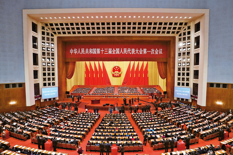2018年3月11日,十三屆全國人大一次會議在北京人民大會堂舉行第三次全體會議,表決通過《中華人民共和國憲法修正案》。這次修改憲法,在憲法序言確定黨的領(lǐng)導(dǎo)地位的基礎(chǔ)上,將“中國共產(chǎn)黨領(lǐng)導(dǎo)是中國特色社會主義最本質(zhì)的特征”寫入總綱。圖為十三屆全國人大一次會議第三次全體會議會場。 新華社記者 王曄/攝