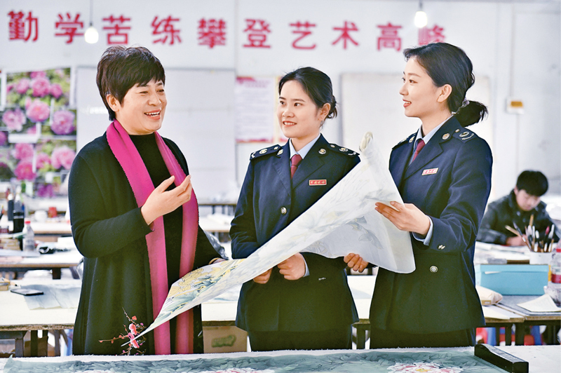 山東省菏澤市巨野縣依托“菏澤牡丹”的資源優(yōu)勢,著力打造工筆牡丹畫文化產(chǎn)業(yè),鞏固脫貧攻堅成果,有序推進鄉(xiāng)村振興。圖為2021年3月20日,巨野縣稅務(wù)局“稅收專家顧問團”成員上門走訪,在魯西書畫院向院長徐鳳秋(左)介紹針對工筆牡丹畫產(chǎn)業(yè)的減稅降費優(yōu)惠政策。 新華社記者 郭緒雷/攝
