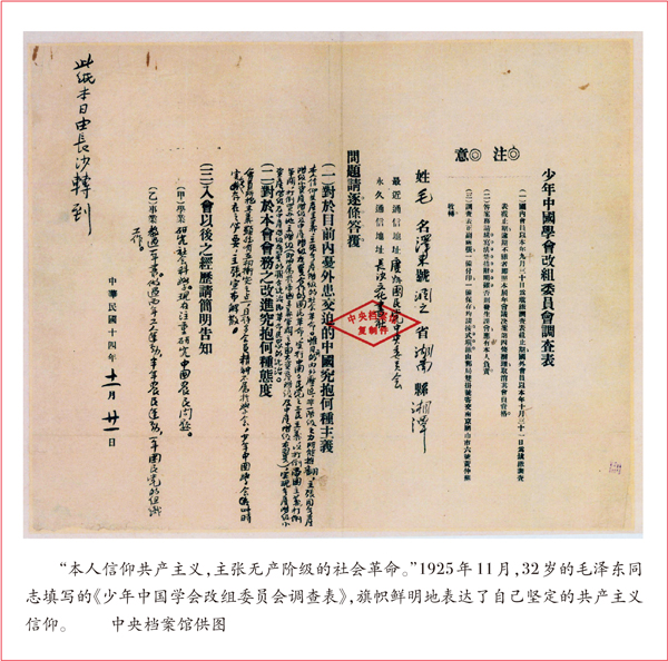 ——“毛澤東同志在青年時期就立下拯救民族于危難的遠(yuǎn)大志向……十月革命一聲炮響,給中國送來了馬克思列寧主義。從紛然雜陳的各種觀點(diǎn)和路徑中,經(jīng)過反復(fù)比較和鑒別,毛澤東同志毅然選擇了馬克思列寧主義,選擇了為實現(xiàn)共產(chǎn)主義而奮斗的崇高理想。在此后的革命生涯中,不管是‘倒海翻江卷巨瀾’,還是‘雄關(guān)漫道真如鐵’,毛澤東同志始終都矢志不移、執(zhí)著追求?!?/p>