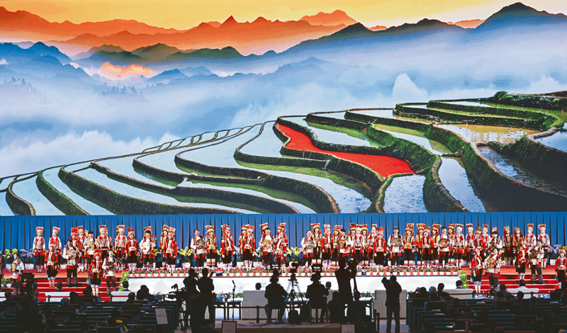 2021年10月14日,2020年聯(lián)合國(guó)生物多樣性大會(huì)(第一階段)生態(tài)文明論壇在云南省昆明市開(kāi)幕。圖為開(kāi)幕式上的表演。 新華社記者 陳曄華/攝