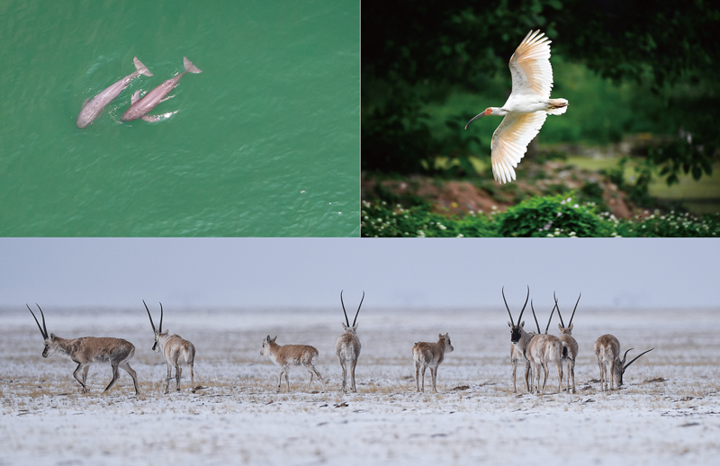 我國(guó)系統(tǒng)實(shí)施瀕危物種拯救工程,多種瀕危野生動(dòng)植物得到有效保護(hù)和恢復(fù)。這是一張拼版照片:左上圖為2021年5月11日,在湖北省宜昌市江邊,長(zhǎng)江江豚在水中嬉戲(無(wú)人機(jī)照片,新華社記者 肖藝九/攝);右上圖為2021年5月13日拍攝的陜西省漢中市洋縣朱鹮生態(tài)園內(nèi)的朱鹮(新華社記者 劉瀟/攝);下圖為2021年4月20日,藏羚羊在三江源可可西里地區(qū)活動(dòng)(新華社記者 吳剛/攝)。