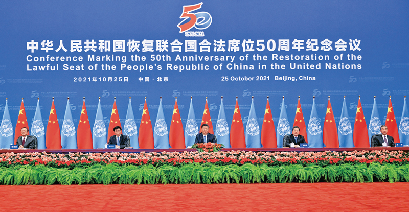 2021年10月25日,國(guó)家主席習(xí)近平在北京出席中華人民共和國(guó)恢復(fù)聯(lián)合國(guó)合法席位50周年紀(jì)念會(huì)議并發(fā)表重要講話。 新華社記者 李學(xué)仁/攝