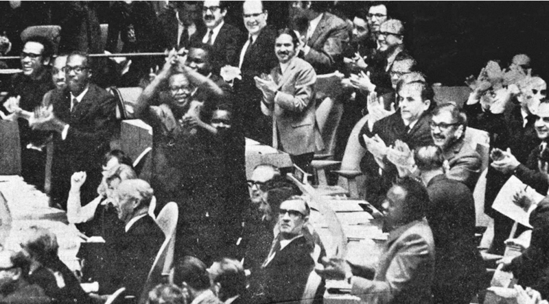 1971年10月25日,第二十六屆聯(lián)合國(guó)大會(huì)以壓倒性多數(shù)通過(guò)第2758號(hào)決議,決定恢復(fù)中華人民共和國(guó)在聯(lián)合國(guó)的一切權(quán)利,承認(rèn)中華人民共和國(guó)政府代表是中國(guó)在聯(lián)合國(guó)的唯一合法代表。圖為當(dāng)電子計(jì)票牌上出現(xiàn)表決結(jié)果時(shí),代表們熱烈鼓掌,歡呼這一全世界人民和一切主持正義的國(guó)家的勝利。 新華社發(fā)