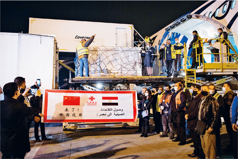 2021年2月23日凌晨,在埃及開(kāi)羅國(guó)際機(jī)場(chǎng),工作人員運(yùn)輸中國(guó)援助埃及的首批新冠疫苗。 新華社記者 鄔惠我/攝