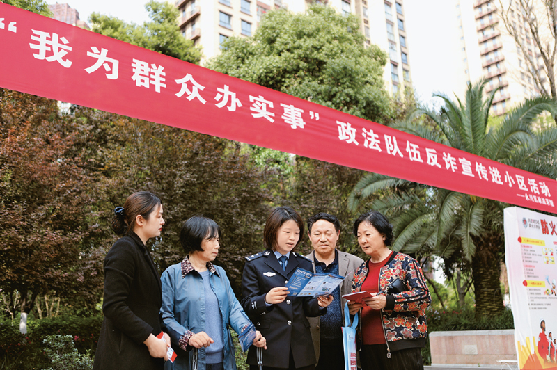圖為2021年3月17日,重慶市永川區(qū)政法干警和物業(yè)管理平安志愿者走進(jìn)中山路街道華貿(mào)國(guó)際小區(qū),開展“我為群眾辦實(shí)事”政法隊(duì)伍反詐宣傳進(jìn)小區(qū)活動(dòng),通過政法干警走進(jìn)群眾、回應(yīng)期盼、解決難題,切實(shí)提升群眾安全感、滿意度?!≈醒胝ㄎ麄鹘逃止﹫D 陳仕川/ 攝