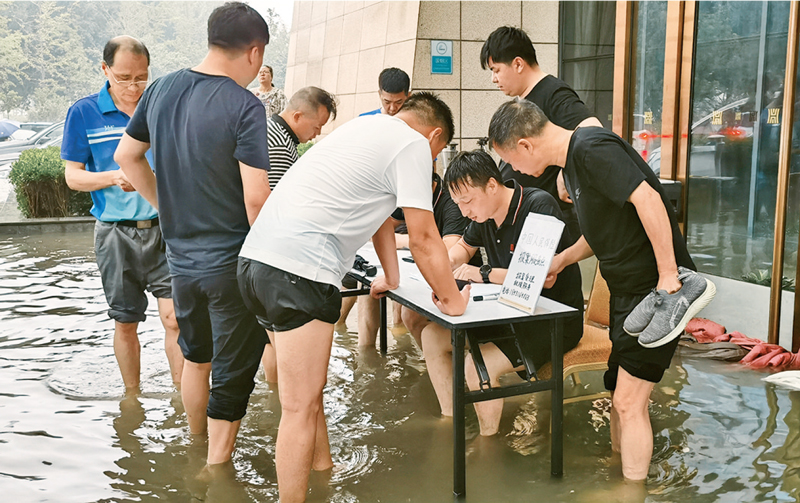 圖為2021年7月22日,河南安陽遭遇水災,中國人民保險理賠人員在臨時搭建的理賠點開展理賠?!≈袊嗣癖kU集團供圖