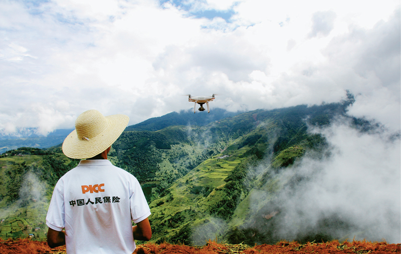 圖為人保財險四川分公司農險工作人員運用無人機查勘,快速精準定損理賠,助力農民抵抗風險、減少損失?!≈袊嗣癖kU集團供圖