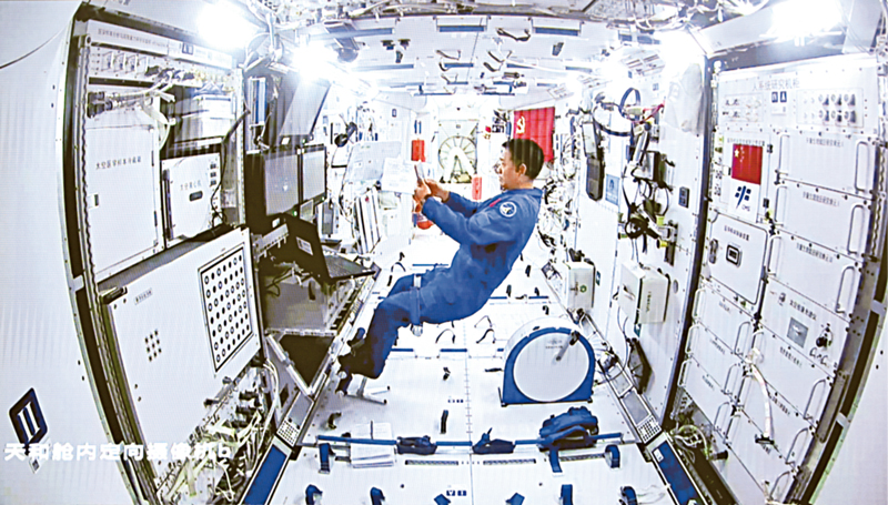 2021年6月17日,神舟十二號(hào)載人飛船發(fā)射升空。飛船搭載了一面黨旗,這面黨旗在中國(guó)共產(chǎn)黨成立100周年之際進(jìn)入中國(guó)空間站內(nèi),經(jīng)歷了我國(guó)空間站階段首次載人飛行任務(wù)取得圓滿成功的全過(guò)程。圖為2021年7月4日,在北京航天飛行控制中心大屏拍攝的天和核心艙內(nèi)航天員聶海勝配合支持兩名出艙航天員開(kāi)展艙外操作。 新華社記者 金立旺/攝