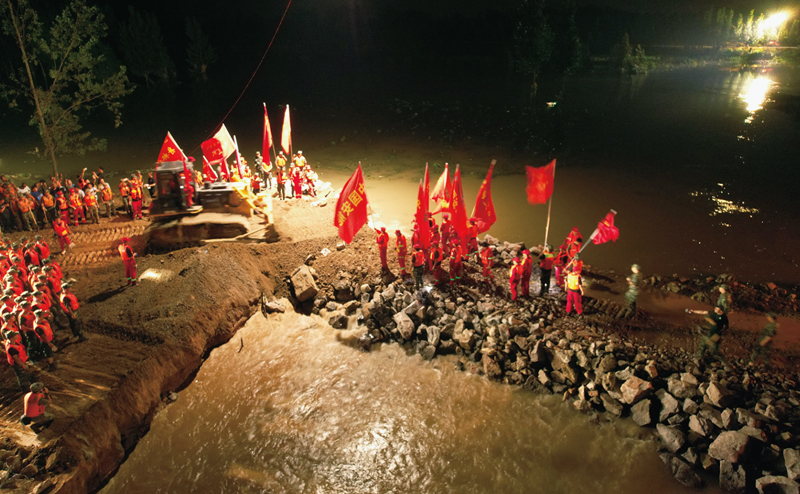 2021年7月17日至23日,河南持續(xù)遭遇極端強(qiáng)降雨天氣。7月22日,鶴壁市??h新鎮(zhèn)鎮(zhèn)彭村段衛(wèi)河大堤發(fā)生決口。前來(lái)救援的中國(guó)安能集團(tuán)在搶險(xiǎn)一線成立4個(gè)黨小組,分別負(fù)責(zé)現(xiàn)場(chǎng)指揮、決口封堵、裹頭加固、綜合保障工作。在黨小組的組織下,現(xiàn)場(chǎng)169名救援人員匯聚成沖不垮的“紅色堤壩”,經(jīng)過(guò)70多個(gè)小時(shí)的艱苦奮戰(zhàn),終于使衛(wèi)河大堤決口合龍。這是2021年7月26日凌晨決口成功合龍后,救援人員在大堤上揮舞紅旗(無(wú)人機(jī)照片)。 新華社發(fā) 張小明/攝
