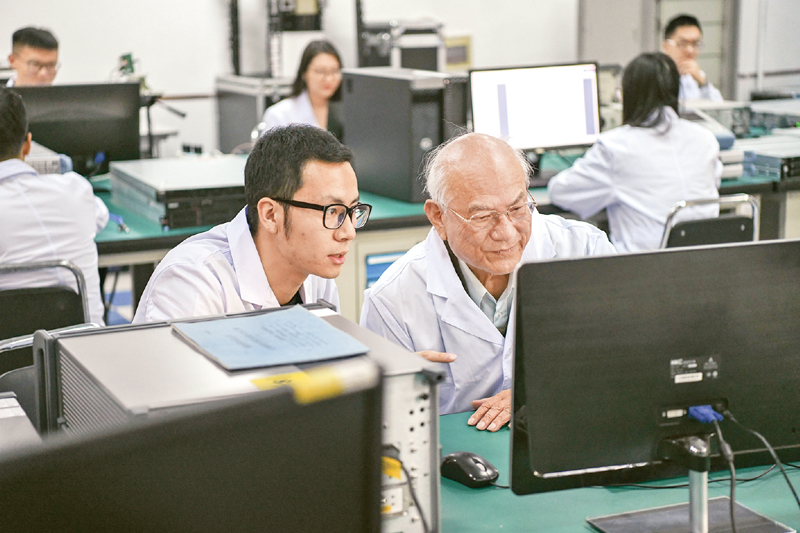劉永坦躬耕杏壇一甲子,不斷培養(yǎng)造就愛國奉獻、勇于創(chuàng)新的優(yōu)秀人才,帶出了新體制雷達領域老中青三代人才梯隊。圖為劉永坦(前右)在哈爾濱工業(yè)大學實驗室和青年研究人員一起鉆研雷達技術(2018年12月25日攝)。 新華社記者 王松/攝