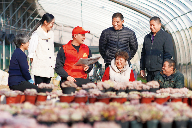 河北省邢臺市內(nèi)丘縣組織六十二支“小馬扎”宣講小分隊深入到社區(qū)、學校、農(nóng)村和企業(yè),利用快板、詩歌、說唱等群眾喜聞樂見的形式開展宣講活動,把黨的十九屆六中全會精神送到群眾家門口。圖為2021年11月23日,“小馬扎”宣講小分隊隊員在馬澗村花卉大棚宣講全會精神。 人民圖片 劉繼東/攝
