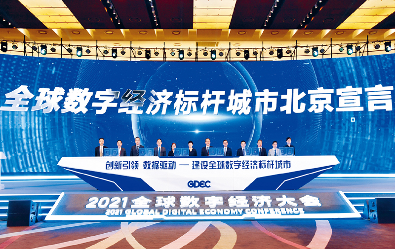 2021年8月2日,2021全球數(shù)字經(jīng)濟大會在北京國家會議中心舉行。圖為《全球數(shù)字經(jīng)濟標桿城市北京宣言》在大會主論壇上發(fā)布。 中新社發(fā) 2021全球數(shù)字經(jīng)濟大會供圖
