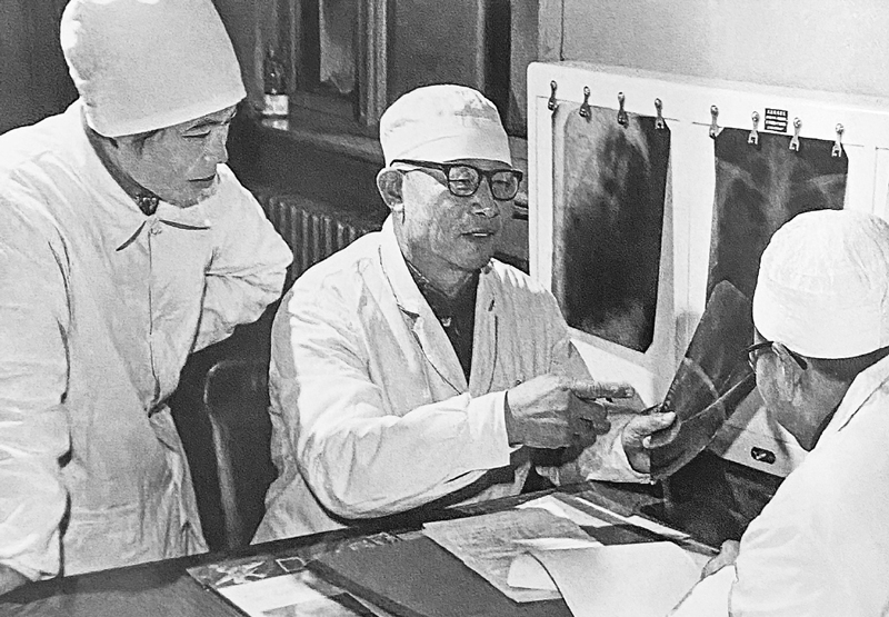 圖為1980年1月16日,辛育齡(中)在內蒙古結核病院與胸外科醫(yī)師討論病例(翻拍照片)。 新華社記者 張玉薇/攝