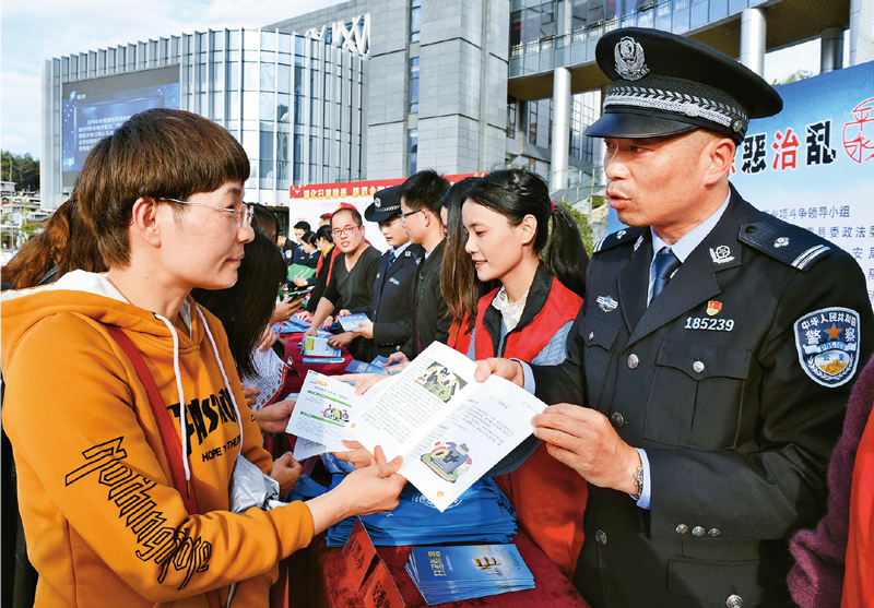 鞏固深化掃黑除惡專項斗爭、政法隊伍教育整頓成果,讓群眾從一個個具體問題的解決中切實感受到公平正義。圖為2020年1月6日,福建省福州市永泰縣公安干警在掃黑除惡專項斗爭宣傳活動上向群眾介紹專項斗爭成果。 新華社記者 張國俊/攝
