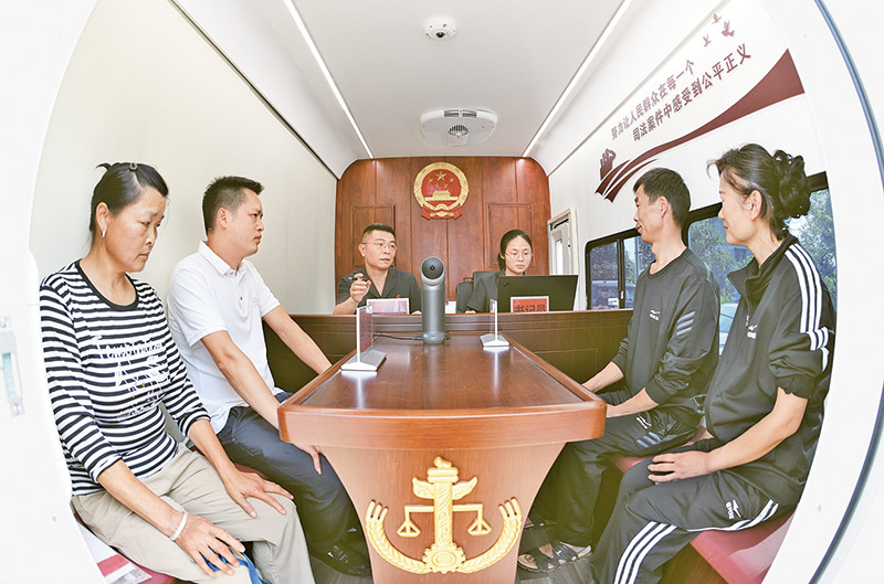 2021年9月1日,一款新式“車載便民法庭”開(kāi)進(jìn)重慶市云陽(yáng)縣鳳鳴鎮(zhèn)五同村,調(diào)查、辯論、舉證、質(zhì)證、打印、簽收可于車內(nèi)一次性完成,并與機(jī)關(guān)數(shù)字化法庭實(shí)現(xiàn)信息實(shí)時(shí)傳輸。圖為“車載便民法庭”庭審現(xiàn)場(chǎng)。 中新社發(fā) 饒國(guó)君/攝