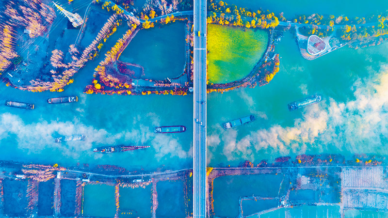 京杭大運河是古代交通文明成果和現(xiàn)代內(nèi)河航運成果的歷史見證。作為我國南北向的水上運輸大動脈,京杭大運河在我國綜合運輸體系建設和長三角地區(qū)經(jīng)濟社會發(fā)展中具有重要的地位和作用。圖為2021年12月4日,滿載貨物的船只通過京杭大運河江蘇省宿遷市宿城段?!∏笫菆D片 馬海峰/攝