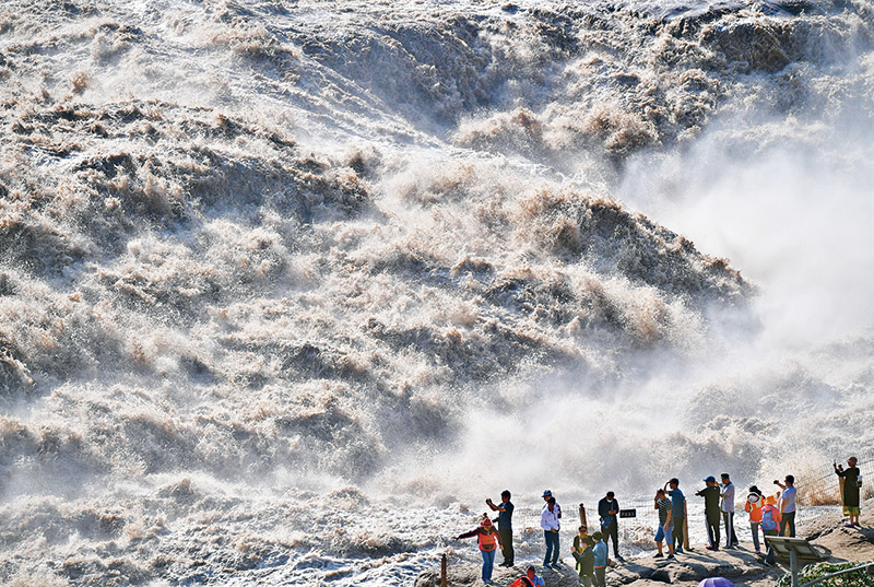 圖為2020年9月11日,游人在陜西省宜川縣黃河壺口瀑布景區(qū)參觀拍照。 新華社記者 邵瑞/攝