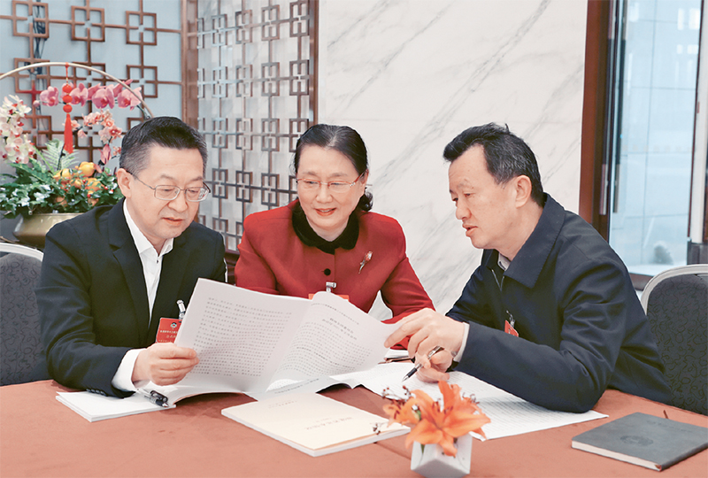 圖為2022年3月4日,致公黨界別和僑聯(lián)界別住閩全國政協(xié)委員在駐地討論修改提案?!「=ㄊ≌f(xié)供圖