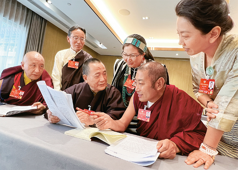 圖為出席全國政協(xié)十三屆五次會議的住藏全國政協(xié)委員認(rèn)真討論政府工作報告和政協(xié)常委會工作報告?!∥鞑刈灾螀^(qū)政協(xié)供圖