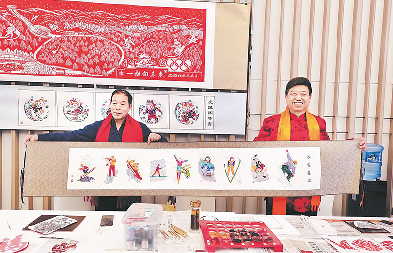 圖為來自河北省張家口市蔚縣的省級非遺傳承人高佃亮(右)展示冬奧題材蔚縣剪紙作品?!『颖比請笊绻﹫D