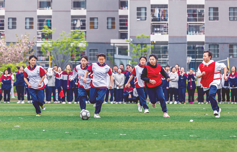 2022年積極的財政政策突出保基本兜底線,切實保障和改善民生。其中,包括支持建設(shè)高質(zhì)量教育體系,優(yōu)化教育支出結(jié)構(gòu),增加義務(wù)教育經(jīng)費投入,促進義務(wù)教育優(yōu)質(zhì)均衡發(fā)展和城鄉(xiāng)教育一體化。圖為2022年3月29日,學(xué)生在貴州省黔西一中參加足球比賽。 人民圖片 范暉/攝