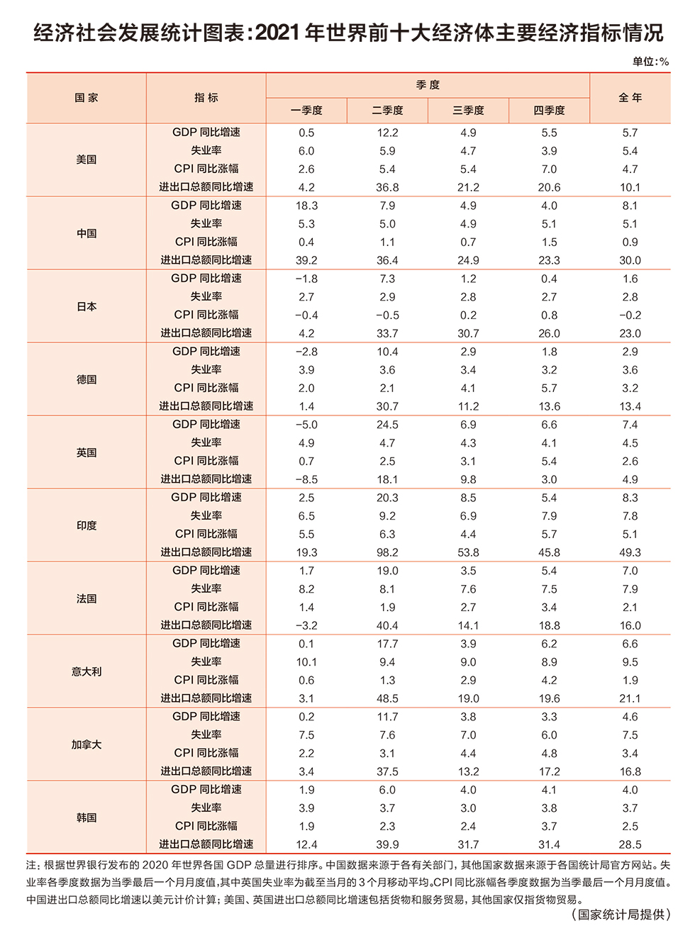 經(jīng)濟社會發(fā)展統(tǒng)計圖表:2021年世界前十大經(jīng)濟體主要經(jīng)濟指標(biāo)情況