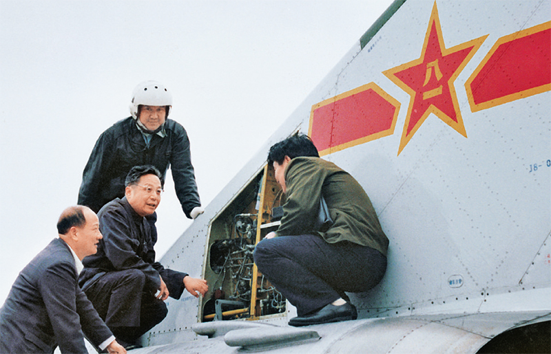 圖為顧誦芬(左二)和科技人員在機(jī)上研究技術(shù)問題(資料照片)。 新華社發(fā) 航空工業(yè)沈飛供圖