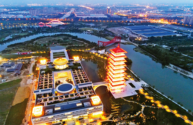 2021年6月16日,位于江蘇省揚州市運河三灣生態(tài)文化公園內(nèi)的中國大運河博物館正式開館。博物館總面積約7.9萬平方米,內(nèi)設(shè)11個專題展覽。圖為揚州中國大運河博物館夜景(無人機照片)。 新華社發(fā) 孟德龍/攝