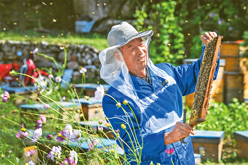 共同富裕要靠勤勞智慧來創(chuàng)造。山西省大同市靈丘縣充分發(fā)揮自身資源特色和優(yōu)勢,走上了生態(tài)優(yōu)美、產(chǎn)業(yè)興旺、生活美好的“農(nóng)業(yè)+旅游”致富路。圖為2021年9月23日,靈丘縣邊氏養(yǎng)蜂專業(yè)合作社社員在檢查蜂箱情況。 新華社記者 柴婷/攝