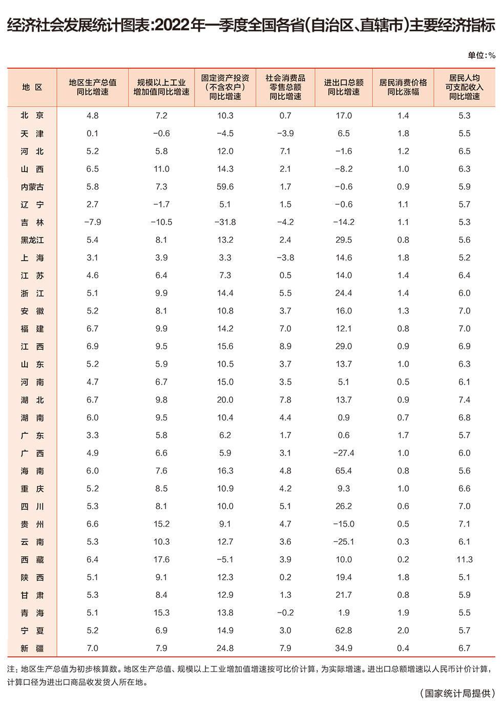 經(jīng)濟社會發(fā)展統(tǒng)計圖表:2022年一季度全國各省(自治區(qū)、直轄市)主要經(jīng)濟指標(biāo)