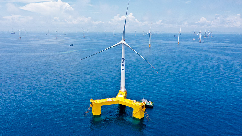 2021年12月7日,我國(guó)首個(gè)漂浮式海上風(fēng)電平臺(tái),搭載全球首臺(tái)抗臺(tái)風(fēng)型漂浮式海上風(fēng)電機(jī)組,組成“三峽引領(lǐng)號(hào)”,在廣東陽(yáng)江海上風(fēng)電場(chǎng)成功并網(wǎng)發(fā)電,標(biāo)志著我國(guó)率先在全球具備大容量抗臺(tái)風(fēng)型漂浮式海上風(fēng)電機(jī)組自主研發(fā)、制造、安裝及運(yùn)營(yíng)能力。圖為“三峽引領(lǐng)號(hào)”航拍圖。 中國(guó)三峽新能源(集團(tuán))股份有限公司供圖