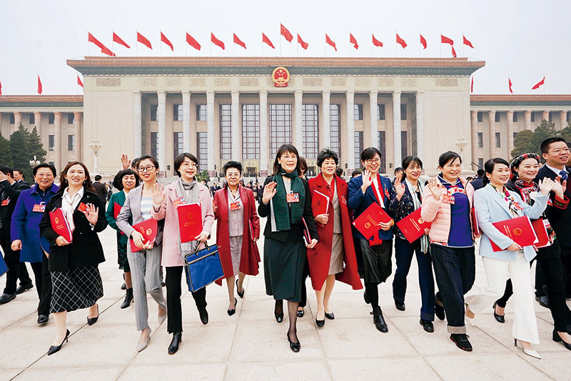黨的十八大以來,在推進國家治理體系和治理能力現(xiàn)代化進程中,婦女參與國家和社會事務(wù)管理的水平全面提升,在民主政治建設(shè)中的作用日益增強。作為我國政治生活中的一件大事,全國兩會上的女性身影越來越多。人大女代表、政協(xié)女委員認真履職盡責、建言獻策,充分展現(xiàn)了新時代女性風采。圖為2022年3月11日,第十三屆全國人民代表大會第五次會議在京閉幕后,代表走出人民大會堂。 新華社記者 高潔/攝