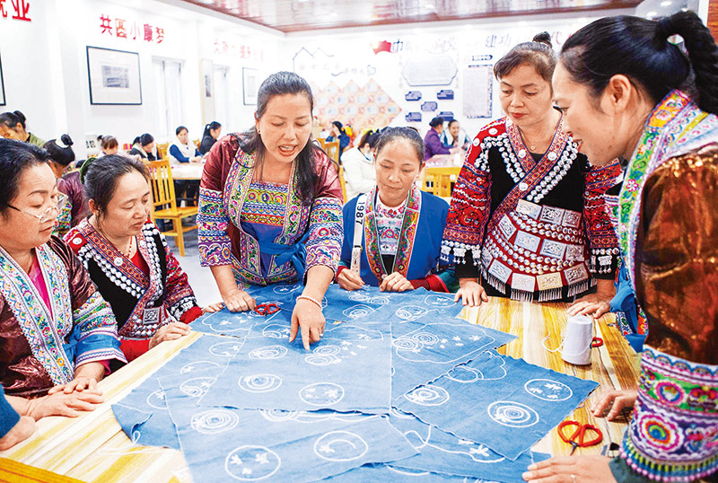 2021年11月4日,廣西融水苗族自治縣舉辦民族手工藝(苗繡)培訓(xùn)班,易地扶貧搬遷社區(qū)苗家小鎮(zhèn)40多名婦女參加培訓(xùn),為居家就業(yè)打下基礎(chǔ)。圖為授課老師在講評學員繡品。 中新社發(fā) 龍濤/攝