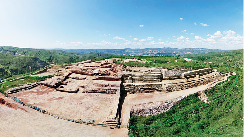 石峁城是10年前發(fā)現(xiàn)的用石塊砌筑的山城,距今4100—3900年,面積400萬平方米。石峁城由外城、內(nèi)城和皇城構(gòu)成,有多種防御設(shè)施。城內(nèi)核心處的皇城臺,總高度達(dá)數(shù)十米,臺頂有面積數(shù)千平方米的大型宮殿建筑,宮殿臺基上有雕刻獸面及各種動物形象的石條和石柱。在皇城臺還發(fā)現(xiàn)多件高50多厘米到1米的陶鷹,應(yīng)與某種信仰和崇拜有關(guān)。石峁城有濃厚的軍事防御色彩,在城內(nèi)還發(fā)現(xiàn)多處埋有青年女性頭骨的祭祀坑,這表明在夏王朝建立前夕,陜北地區(qū)的階級分化已相當(dāng)嚴(yán)重,出現(xiàn)了擁有強(qiáng)大軍事力量的王權(quán)國家。