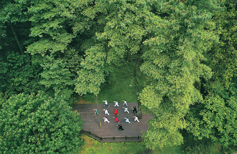 2022年以來(lái),貴州省貴陽(yáng)市以長(zhǎng)坡嶺國(guó)家級(jí)森林公園為試點(diǎn),建設(shè)貴州首個(gè)“林長(zhǎng)制”主題公園,開展習(xí)近平生態(tài)文明思想、林長(zhǎng)制政策、森林資源保護(hù)發(fā)展政策等宣傳,促進(jìn)形成全社會(huì)愛林、護(hù)林、興林的良好氛圍。圖為2022年7月13日,市民在長(zhǎng)坡嶺國(guó)家級(jí)森林公園里健身(無(wú)人機(jī)照片)?!⌒氯A社記者 楊文斌/攝