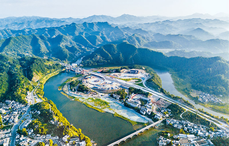 基礎(chǔ)設(shè)施是經(jīng)濟社會發(fā)展的重要支撐。溧寧高速公路途經(jīng)江蘇、安徽、浙江、福建等地,建成通車后將進一步完善高速公路網(wǎng),促進沿線地區(qū)經(jīng)濟社會發(fā)展。圖為2022年8月5日,安徽省黃山市歙縣深渡鎮(zhèn)新安江畔在建的溧寧高速公路深渡服務(wù)區(qū)項目場景。 人民圖片 肖本祥/攝