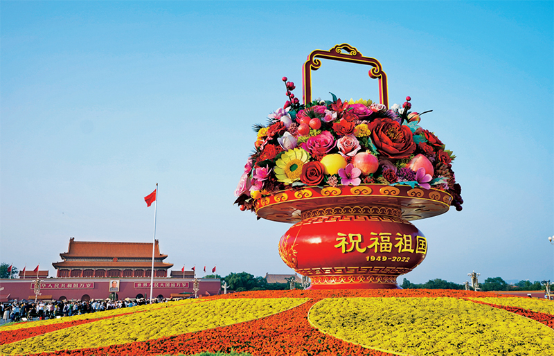 國(guó)慶節(jié)前夕,“祝福祖國(guó)”巨型花果籃亮相北京天安門(mén)廣場(chǎng)。今年“祝福祖國(guó)”巨型花果籃頂高18米,以喜慶的花果籃為主景,花壇底部直徑48米。圖為2022年9月25日拍攝的“祝福祖國(guó)”巨型花果籃。 新華社記者 陳鐘昊/攝