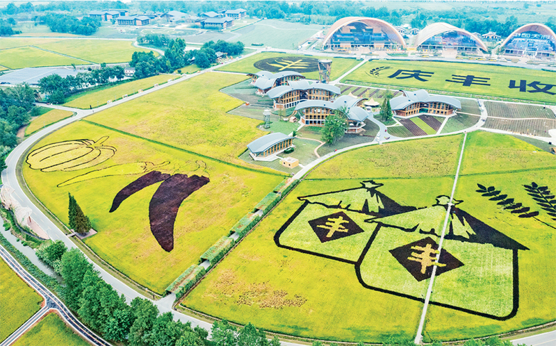 2022年中國(guó)農(nóng)民豐收節(jié)主會(huì)場(chǎng)活動(dòng)于9月23日至10月7日在中國(guó)天府農(nóng)業(yè)博覽園舉辦。這是9月22日在中國(guó)天府農(nóng)業(yè)博覽園拍攝的稻田畫(huà)(無(wú)人機(jī)照片)。 新華社記者 沈伯韓/攝