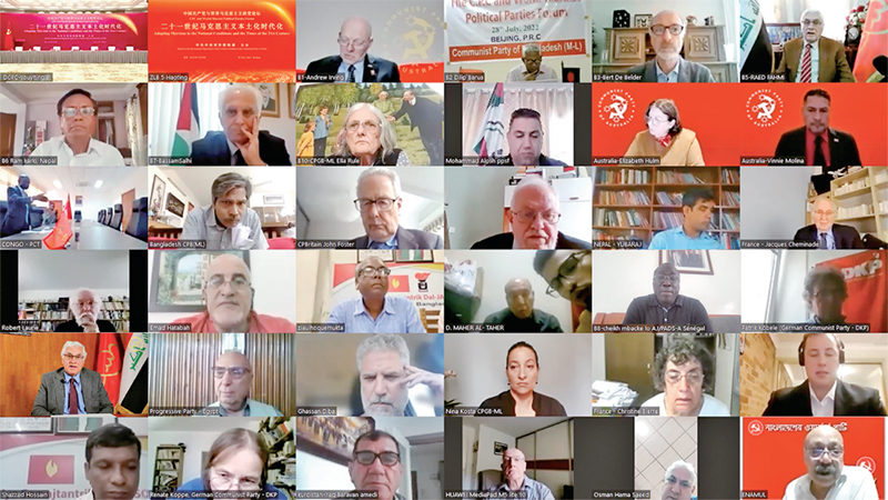 2022年7月28日,中國共產(chǎn)黨與世界馬克思主義政黨論壇舉行。習(xí)近平總書記在賀信中強調(diào),中國共產(chǎn)黨愿同各國馬克思主義政黨加強交流對話,立足本國國情,把準時代脈搏,不斷豐富和發(fā)展馬克思主義,在攜手推動構(gòu)建人類命運共同體的進程中讓馬克思主義展現(xiàn)出更強大的真理力量。圖為外國政黨代表線上參加論壇。 中共中央對外聯(lián)絡(luò)部供圖