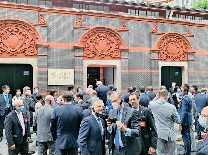 2021年6月16日,“中國共產(chǎn)黨的故事——習(xí)近平新時代中國特色社會主義思想在上海的實踐”特別對話會在上海舉行。近100個國家、126個政黨和友好組織的740多名代表通過視頻連線參加對話會,40多個國家駐華大使現(xiàn)場出席會議。圖為與會駐華使節(jié)參觀中共一大會址。 人民網(wǎng) 馬作鵬/攝