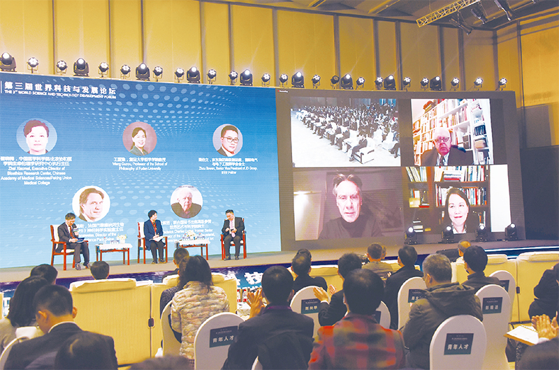 2021年11月6—7日,第三屆世界科技與發(fā)展論壇在京舉辦。論壇以“開放·信任·合作”為主題,探討全球科技創(chuàng)新、科技治理與科學(xué)文化,增進(jìn)全球科技共同體互信合作,促進(jìn)經(jīng)濟(jì)社會(huì)的可持續(xù)健康發(fā)展。圖為中外專家線上線下圍繞“科技倫理治理與信任合作”進(jìn)行高端對(duì)話?!≈行律绨l(fā) 孫自法/攝