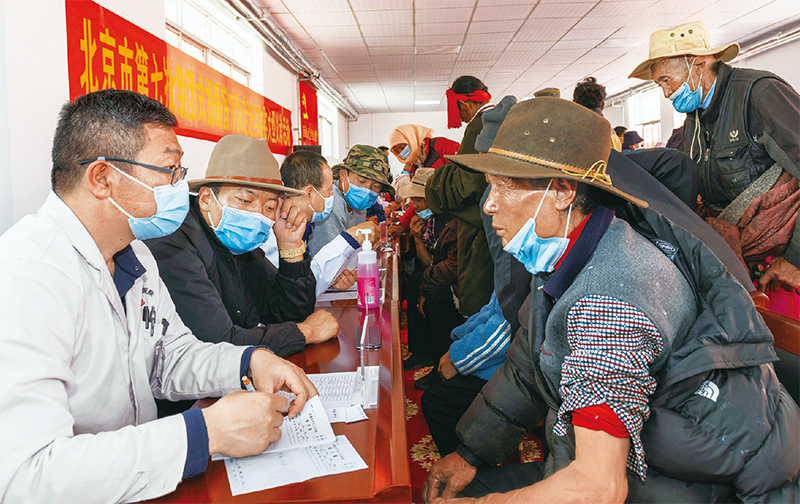2022年6月9日,來自拉薩市人民醫(yī)院的北京市第七批“組團(tuán)式”援藏醫(yī)療專家,來到當(dāng)雄縣格達(dá)鄉(xiāng)為居民義診。 新華社記者 周荻瀟/攝