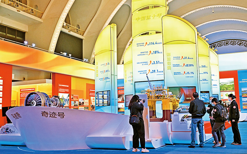 黨的十八大以來,以習(xí)近平同志為核心的黨中央提出并貫徹新發(fā)展理念,著力推進(jìn)高質(zhì)量發(fā)展,推動構(gòu)建新發(fā)展格局,實(shí)施供給側(cè)結(jié)構(gòu)性改革,制定一系列具有全局性意義的區(qū)域重大戰(zhàn)略,我國經(jīng)濟(jì)實(shí)力實(shí)現(xiàn)歷史性躍升。圖為2022年10月8日,觀眾在“奮進(jìn)新時代”主題成就展中央綜合展區(qū)內(nèi)參觀拍攝中國經(jīng)濟(jì)“奇跡號”巨輪模型?!⌒氯A社記者 李鑫/攝