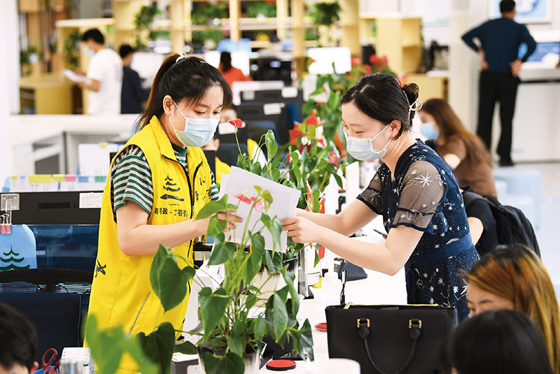 營商環(huán)境是企業(yè)生存發(fā)展的土壤。圖為2022年6月15日,貴州省貴陽市南明區(qū)政務(wù)服務(wù)大廳法人服務(wù)區(qū)的工作人員在給企業(yè)人員講解減稅降費優(yōu)惠政策?!∏笫菆D片 趙松/攝