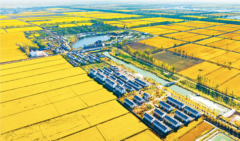 新時(shí)代十年,我國(guó)谷物總產(chǎn)量穩(wěn)居世界首位。圖為2022年11月2日,江蘇省宿遷市泗洪縣石集鄉(xiāng)4.9萬(wàn)畝優(yōu)質(zhì)水稻迎來(lái)豐收季,一排排嶄新的民居與金色的稻田相映生輝,構(gòu)成了一幅美麗的秋日田園畫卷?!∪嗣駡D片 張連華/攝