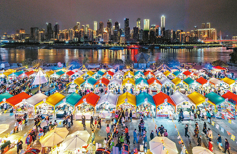 我國(guó)著力推動(dòng)戰(zhàn)略性新興產(chǎn)業(yè)融合集群發(fā)展,加快發(fā)展現(xiàn)代服務(wù)業(yè),推進(jìn)三次產(chǎn)業(yè)深度融合發(fā)展。圖為2022年10月29日,重慶市南岸區(qū)南濱路,市民正在“彩虹集市”游玩選購(gòu)商品?!∪嗣駡D片 龍帆/攝