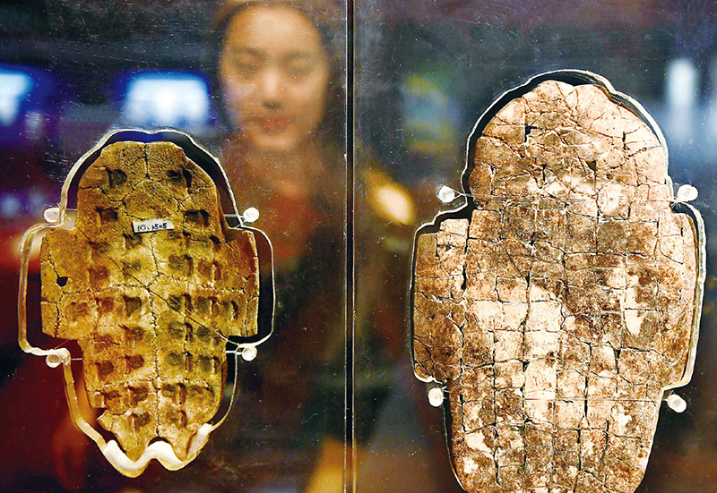 2022年10月28日,習(xí)近平總書記在河南安陽殷墟遺址考察時指出,中華優(yōu)秀傳統(tǒng)文化是我們黨創(chuàng)新理論的“根”,我們推進馬克思主義中國化時代化的根本途徑是“兩個結(jié)合”。圖為游客在河南安陽殷墟博物館觀看展出的卜甲?!⌒氯A社記者 李安/攝