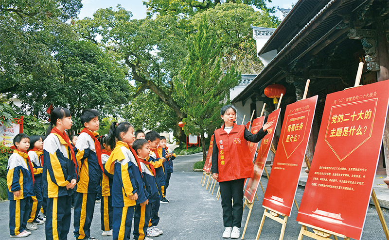 圖為2022年10月25日,浙江省臺州市上張鄉(xiāng)中心小學(xué)的學(xué)生在中共仙居縣委舊址紀念館學(xué)習黨的二十大精神。 人民視覺 王華斌/攝